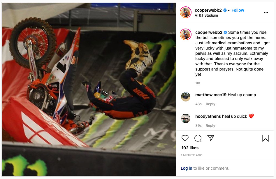 2/29/2020 6:24pm I never thought I would say this, but call me a Cooper Webb fan now. I'm a fan of Kenny and Eli too for different reasons. But Webb's determination and smarts are too much to not respect and appreciate. All of the snottiness of his younger days is gone, and what's left is a warrior who keeps fighting no matter what.