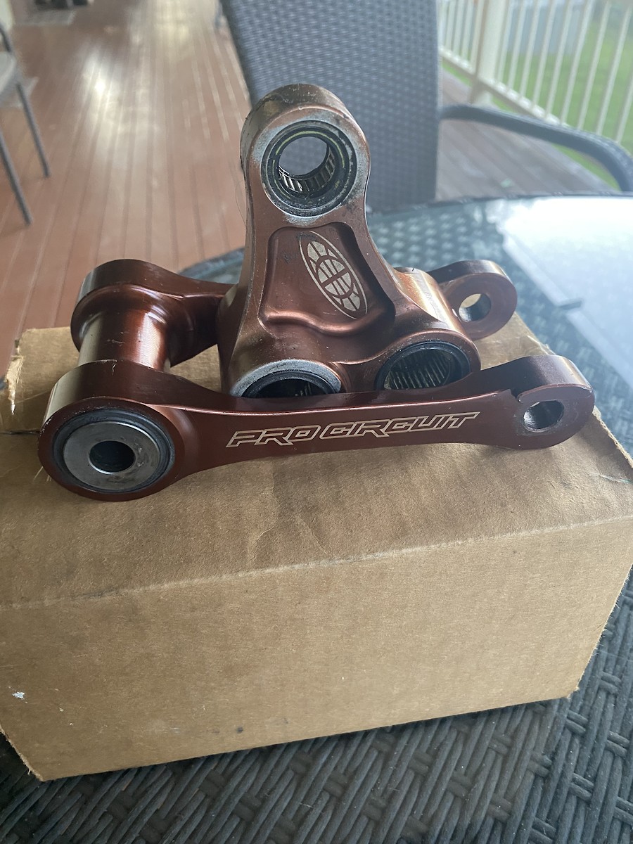 6/15/2022 8:46pm Procircuit linkage system to suit 19-23 kx450 and 21-22 kx250. Good used condition, fair bit of wear off anodising as show in photos. Bearing are in okay condition (they dont come with them new). $315USD shipped from australia. Generally takes 1-2 weeks. Ive sold items on this page before. Thanks