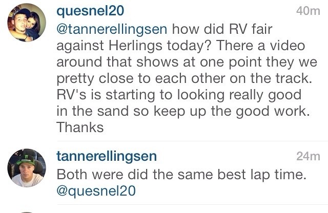 3/20/2015 3:16pm All I know is that Tanner hardly ever posts or answer questions on social media, so if RV just got completely smoked out there today by Herlings I really doubt that he woulda posted what he did. Now even though their best lap times were the same, I still have to assume that Jeffrey was still probably faster as he...