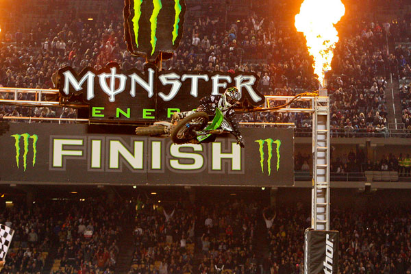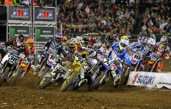 Ryan Dungey (Rockstar Makita Suzuki) and Ryan Villopoto (Monster Energy Kawasaki) had shown their speed in the qualifiers, taking their respective heat races, while James Stewart (San Manuel Red Bull Yamaha) had overshot the first turn after grabbing the holeshot in his qualifier. We also had the scariest moment of the night, as Trey Canard (American Honda Racing) had a gnarly cartwheeling crash in a rhythm section. Fortunately he got up okay.