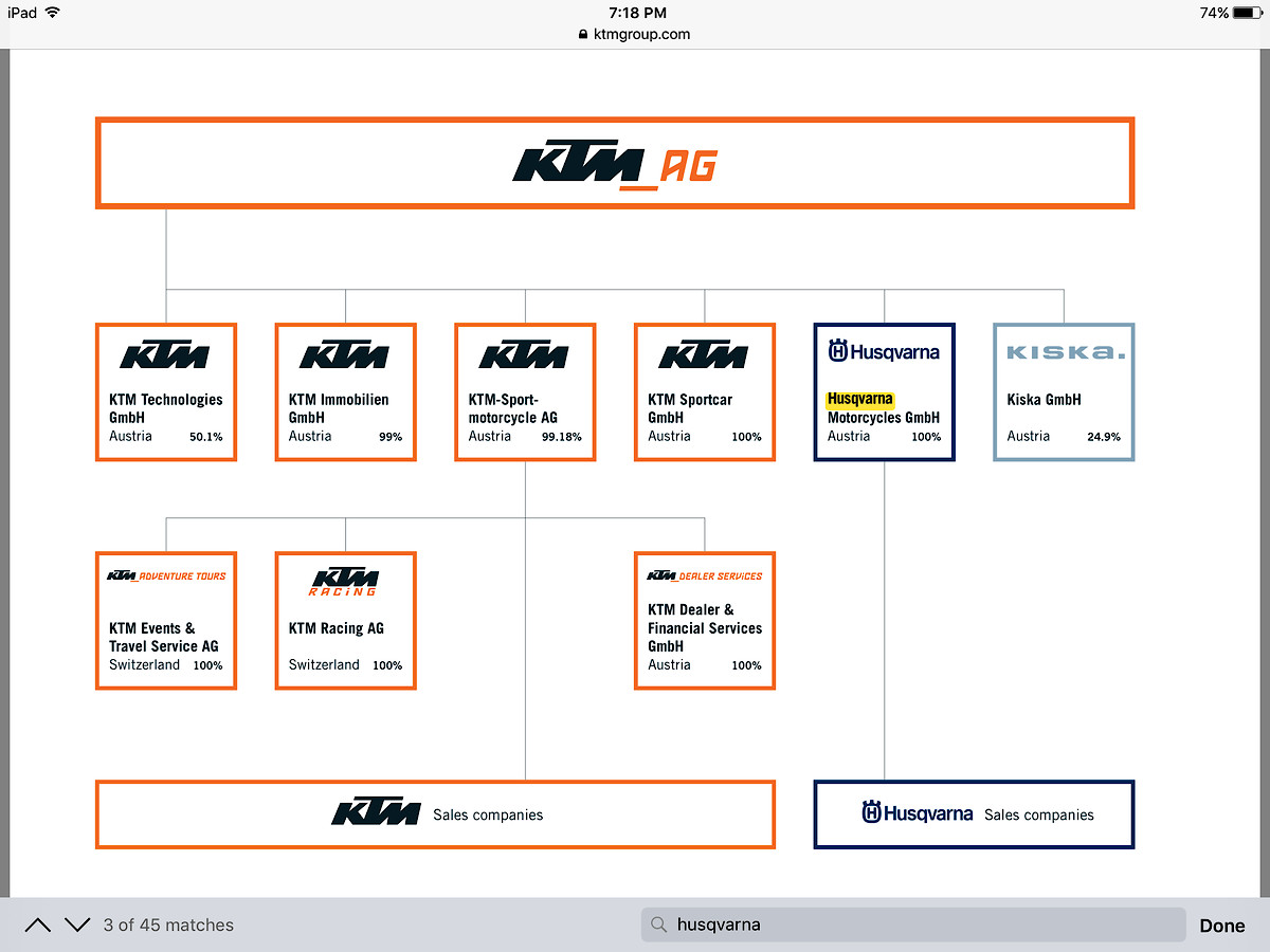 Here is an org chart from their 2014 financial report, which also says that Peirer sold the Husqvarna rights to KTM for €10M.