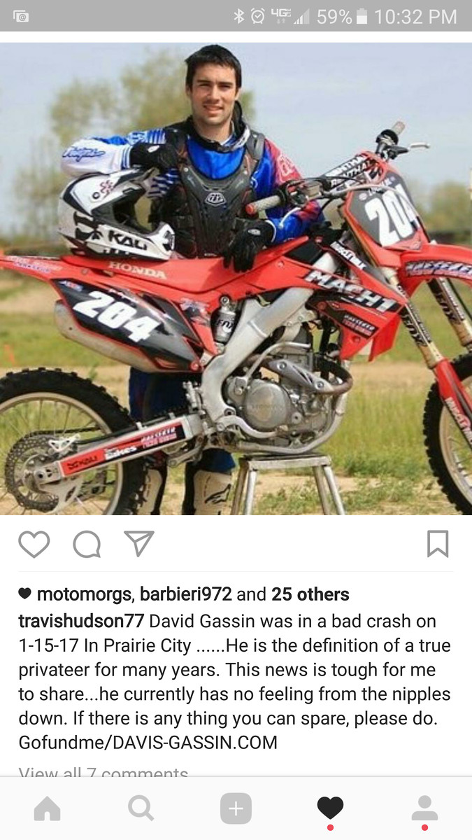 I don't now any details of his situation other than what is in the description of the Gofundme that was set up by a friend of his, but I've known David for many years and he's good person that has been scratching out a living on a dirtbike on his own since he was a teen. I was at Hangtown yesterday, but there was a big off road GP running in the park and I guess that's where his crash happened.