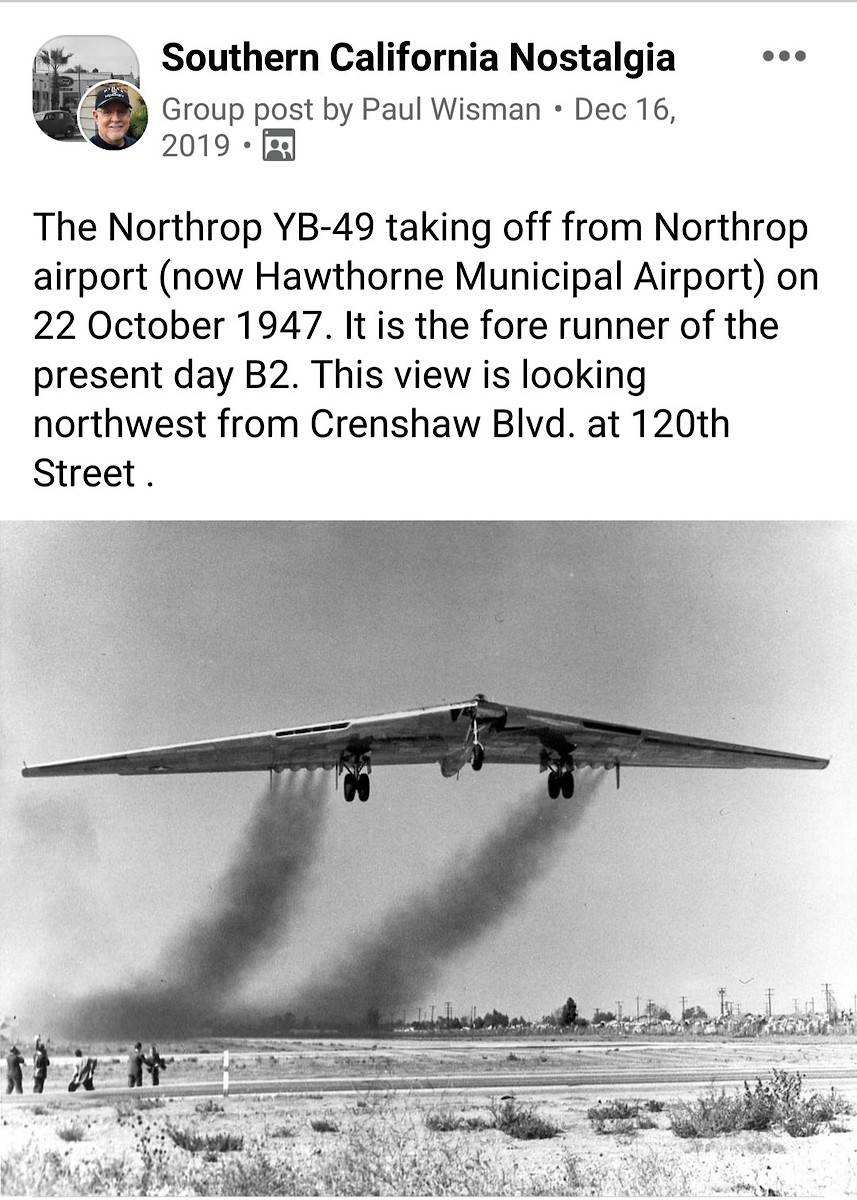 An aerial view of the Northrop "Flying Wings" at the Northrop plant in Hawthorne, taken in 1949. John Northrop, who had previously designed aircraft for Donald Douglas, set up his own company and tried tail-less aircraft. He built several smaller flying wings before designing and building the piston-powered B-35. The later version of the flying wing involved converting some B-35s to jet power, which became the B-49. The Air Force tried both versions but they did not have enough flight stability to accurately drop bombs. The Air Force chose the B-36 and later the B-52 and ordered that all the remaining B-35's and B-49's be cut up for scrap, thus none were saved for museums. The reason for the scrapping was a dispute between Secretary of the Air Force Stuart Symington and John Northrop, as Symington wanted Northrop to merge his smaller company with a larger aircraft maker like Consolidated. Northrop refused and quit the company. Many years later, John Northrop was shown a model of the flying wing B-2, which had the same wing dimensions as did his original Flying Wings. He wept with emotion after realizing that the Air Force had finally adopted his idea. He died shortly after. Photo from the Security Pacific National Bank Collection, Los Angeles Public Library.