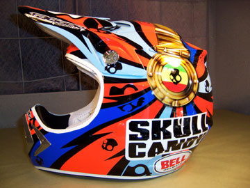 SKULLCANDY is pleased to present this new custom SKULLCANDY BELL MOTO-8 HELMET that East Coast Lites rider Matt Lemoine will be rocking the remainder of the Supercross season. Matt got with TAGGER DESIGNS and came up with a unique design that fit his personal style and the look and feel of SKULLCANDY. Tag got a bit crazy and painted a pair of the Rasta and Gold Foil Ti headphones onto the helmet!